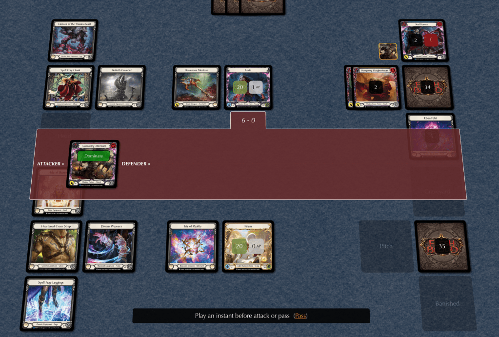 As I’ve discussed in previous posts, Flesh and Blood is a game designed to be played…well with real-life flesh and blood opponents. There is nothing like the real-world experience of sitting across the table from a real person and going head to head in battle. However, there are occasions when playing IRL is just not practical. The pandemic has, until recently in the UK, made it very difficult to get together in an enclosed space as a group, and even with fewer restrictions, events in-store do not always accessible to those working evenings and weekends to join in. The obvious solution is to play Flesh and Blood online, and there are several (non-official) options I have found to allow you to do this, the main ones being Felt Table, Discord and Tabletop Simulator (TTS). I don’t have much experience with TTS, so I’m not going to cover that in this post, but I have played the other two platforms and have some thoughts on each.